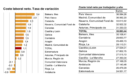 El salario bruto anual de los trabajadores canarios aumentó un 1,8% en 2018, hasta los 19.499 euros, en el que representa el segundo aumento consecutivo tras el del 0,36% registrado en 2017, según la Encuesta Anual de Coste Laboral, elaborada por el INE. De esta manera Canarias se coloca entre las cuatro comunidades donde se registraron los avances porcentuales más importantes, por detrás únicamente de Baleares (+3,4%), País Vasco (+2,4%), y Cataluña (+1,9%).