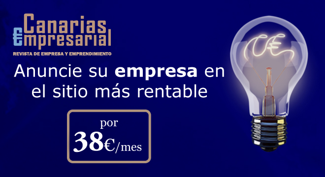Podrá anunciarse en ‘Canarias Empresarial’ con un banner de 720 (largo) x 90 (alto) pixeles o de 315 (largo) x 215 (alto) pixeles, en la portada y en todas las noticias de nuestra revista, durante cuatro semanas, por solo 38 euros. La oferta incluye la difusión del banner con dimensiones similares en el pdf de nuestra newsletter.